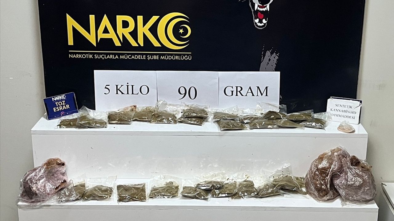 Araçta narkotik dedektör köpeğiyle yapılan aramada koltuğun altına gizlenmiş poşette 5 kilo 90 gram toz esrar bulundu.