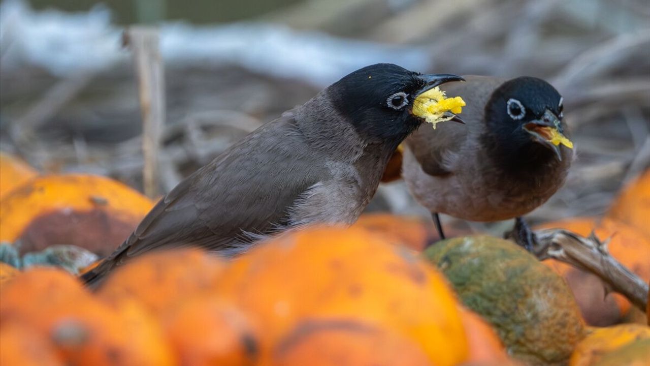 Ağaç diplerinde kalan meyveleri yiyen kuşlar, kamerayla kaydedildi.