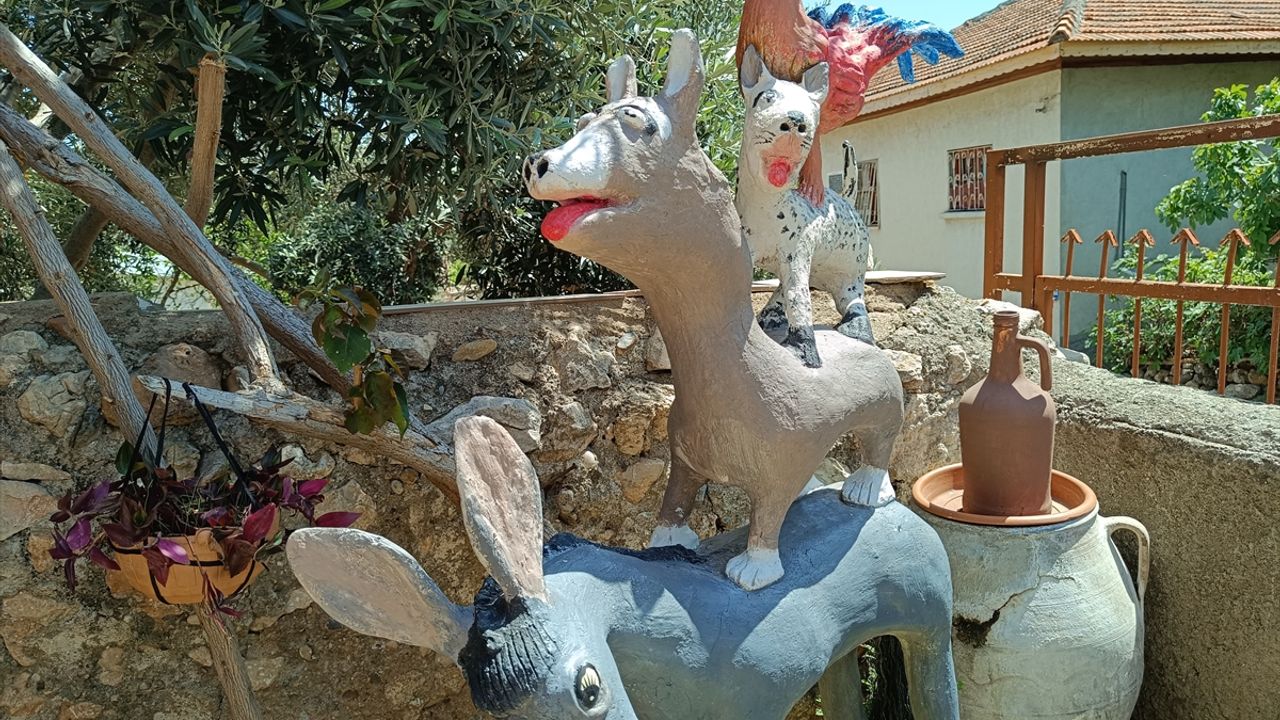 ADANA (AA) - Adana'da yaşayan emekli el sanatları öğretmeni Nadire Kuzu, ağaç dalı, taş ve eski eşya parçalarını kullanarak tasarladığı objeleri müstakil evinin bahçesinde sergiliyor.