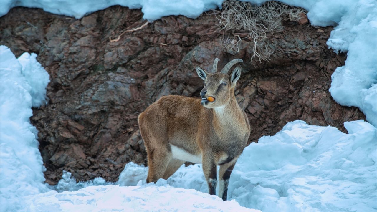 Karlı dağlardan işletme yakınına gelen dağ keçilerine yem ve ekmek verildi.