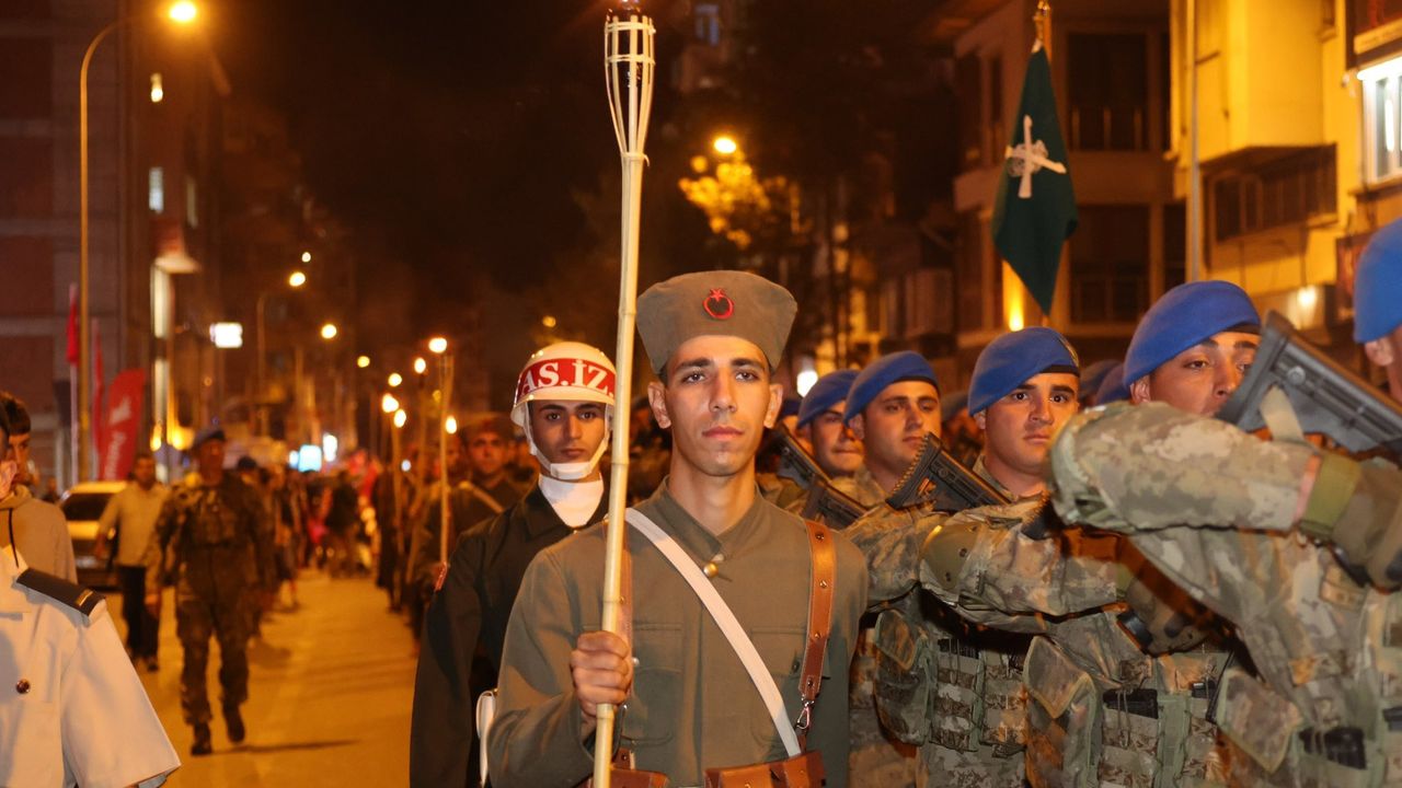 Kurtuluş Caddesi'nden 41'inci Komando Tugay Komutanlığı Birlikleri ve Deniz Kuvvetleri Komutanlığı Bandosu eşliğinde başlayan fener alayında vatandaşlar, ellerinde Türk bayrakları ve meşalelerle, Anıtpark'a kadar yürüdü.