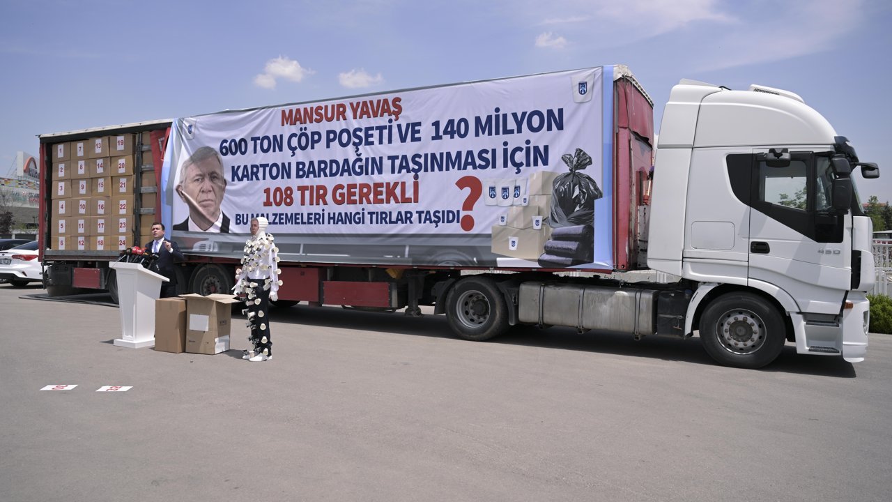 "Arkada görmüş olduğunuz tırımız 4 kapaktan oluşmaktadır. Her bir kapağı 150 adet koli almaktadır. Yani 600 adet koliyi alabilecek kapasitededir. Ankara Büyükşehir Belediyesi 140 milyon tane bardağı, 5 tıra sığdırdığını söylüyor. Fiziken bu imkansızdır. Ayrıca 600 ton da çöp torbası vardır. Biz Sayın Mansur Yavaş'a diyoruz ki 108 tır burada bir malzeme var. Eğer 108 tır malzemeyi 5 tırla taşıdıklarını söylüyorlar ise buradaki soygun çok açık ve net bir şekilde ortadadır. Çünkü 5 tırın içerisine girebilecek sayı 3 bin adettir. 47 bin sayısı nerede, 3 bin sayısı nerededir? Bunu buraya sığdırabilmeniz mümkün değildir. Şöyle bir kültür geliştirdi Cumhuriyet Halk Partisi. Her söylediğimize yalan, her söylediğimize iftira şeklinde beyanatlarda bulunuyorlar. Ben söylediklerimi ispat ediyorum. Arkadaki tırda 600 adet karton bardağın sığabileceği koli var. Tekrar kendilerine soruyorum. 5 tıra 140 milyon taneyi nasıl sığdırıyorsunuz? Sayın Mansur Yavaş bir basın toplantısı yapsın. Bunları buraya nasıl sığdırdığını bize anlatsın."