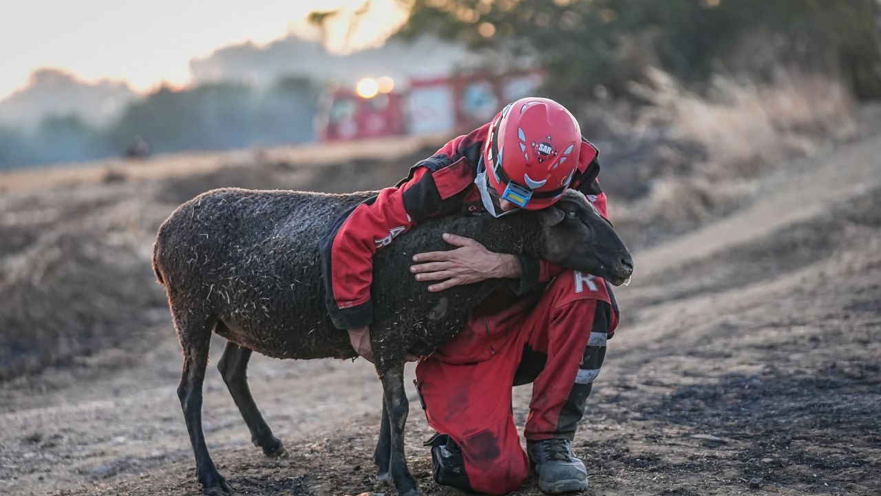 Yangın ulaşmadan neredeyse tamamen boşaltılan tesiste bir koyunun mahsur kaldığını fark eden SAR Arama Kurtarma Acil Yardım Derneği gönüllüleri, alevlerin arasına girdi.