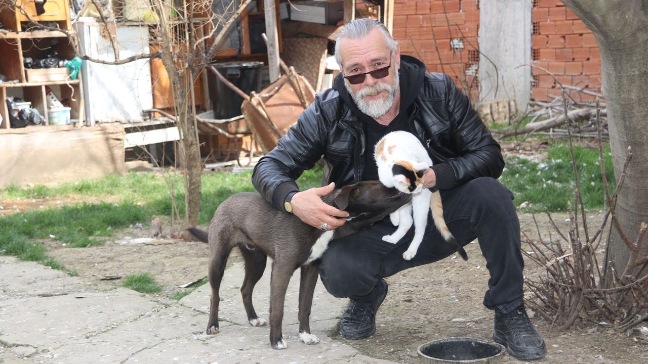 Taşova ilçesine bağlı Yemişen Mahallesi'nde yaşayan 58 yaşındaki Kuru, bahçesinde kedi, köpek ve güvercin besliyor.