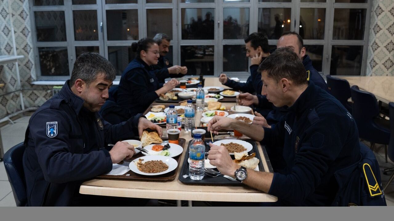 Ankara Büyükşehir Belediyesi İtfaiye Daire Başkanlığı İstasyonu çalışanları, ramazanın ilk sahuru için yapılan hazırlığın ardından aynı sofrada bir araya geldi.