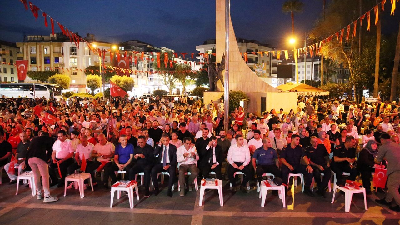 Alanya ilçesinde düzenlenen program ise Şelale Meydanı'nda kortej yürüyüşüyle başladı. Hükümet Meydanı'nda son bulan yürüyüşün ardından düzenlenen etkinlik, saygı duruşu ve İstiklal Marşı'nın okunmasıyla devam etti.