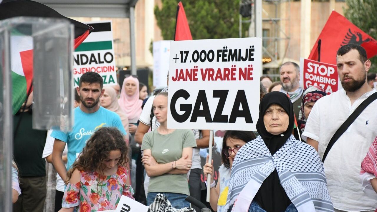 Göstericiler Arnavutluk ve Filistin bayraklarının yanı sıra üzerlerinde "Gazze'deki bombardıman durdurulsun", "Gazze’deki soykırım durdurulsun", "Özgür Filistin", "İsrail, çocukları öldürme", "İki devletli çözüm uygulansın" yazılı pankartlar taşıdı.