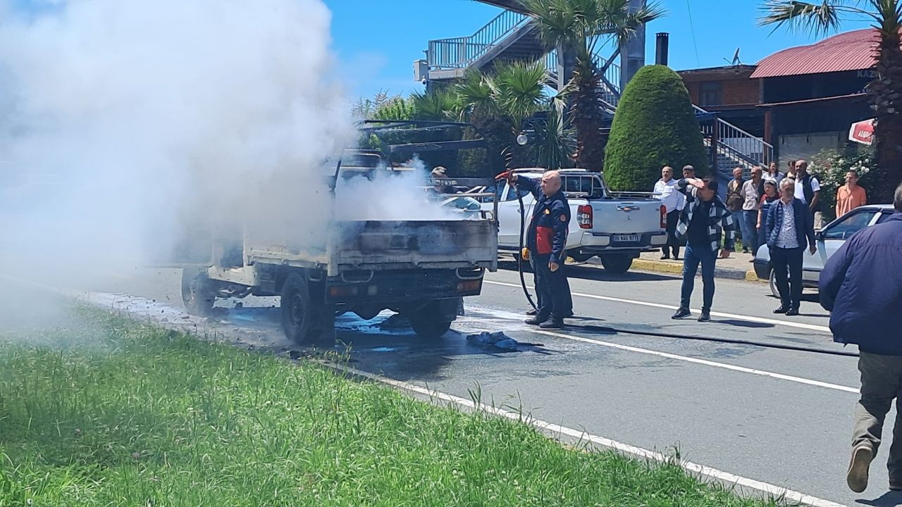 Özdemir Bağdatlı idaresindeki 08 AAE 454 plakalı kamyonette, ilçe merkezinde seyir halindeyken henüz bilinmeyen bir nedenle alev aldı.
