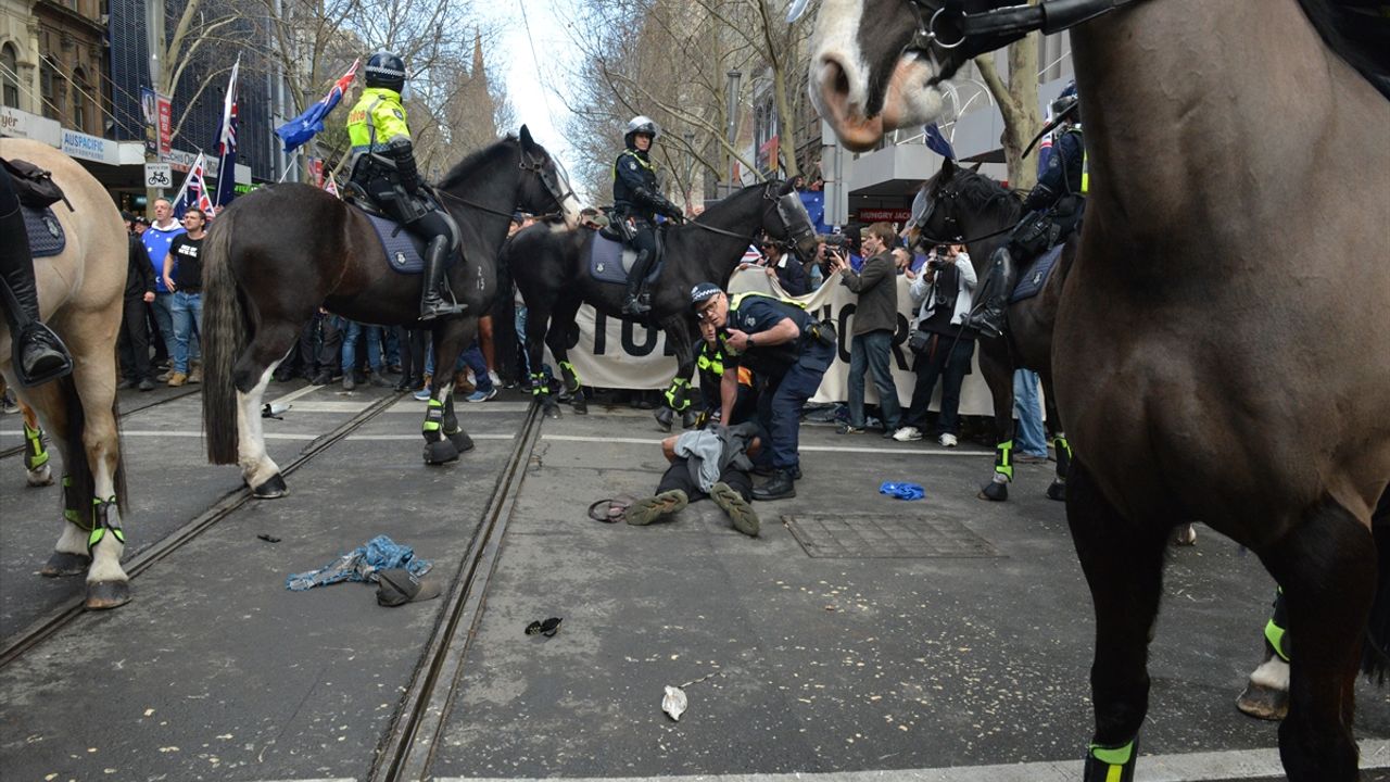 Sabah erken saatlerden itibaren Melbourne kent merkezinde yoğun güvenlik önlemleri alan polisler, iki grubun karşı karşıya gelmesini önlemekte zorlandı.