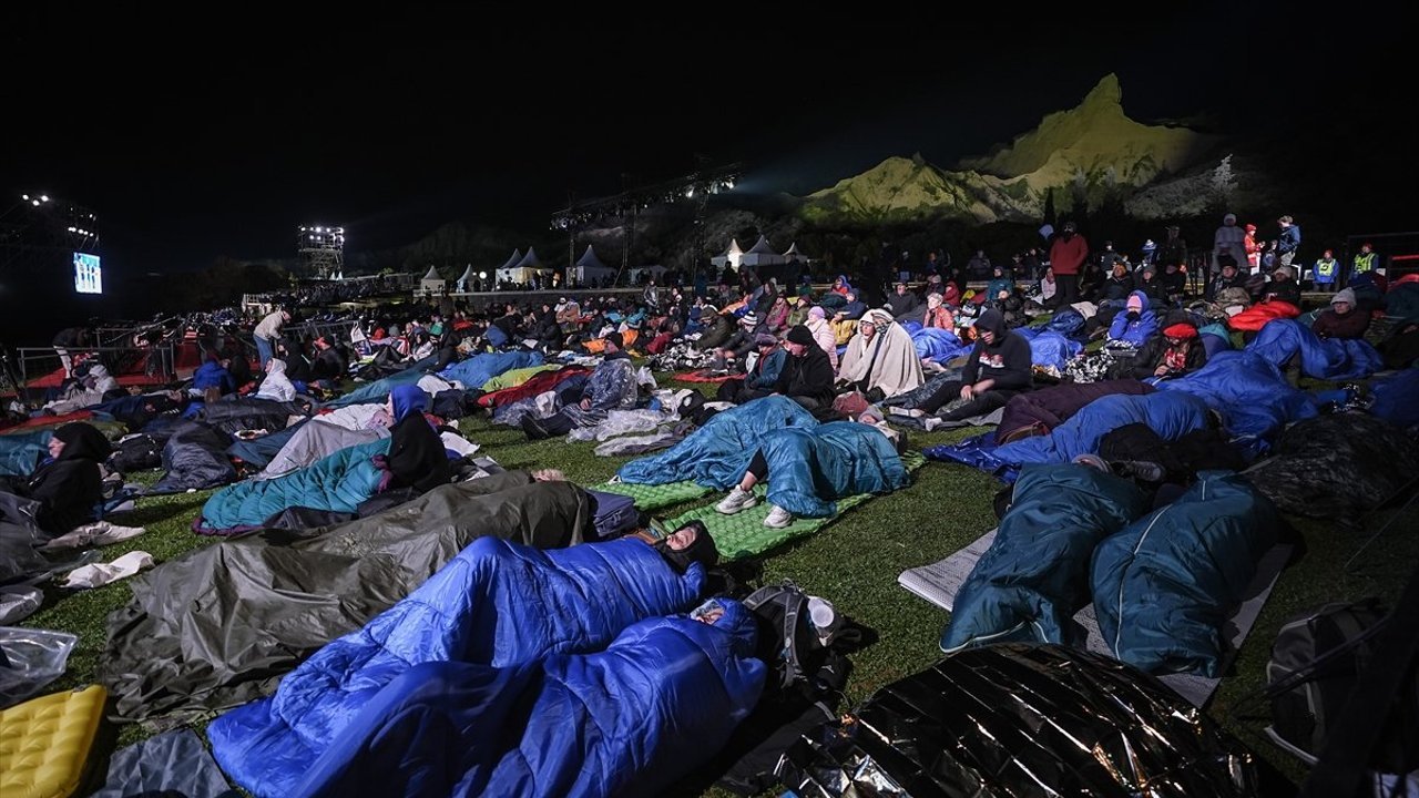Servis araçlarıyla Anzak Koyu'ndaki tören alanına ulaşan Anzak torunları, geleneksel 'Şafak Ayini'nin saatini uyku tulumları ve battaniyeler içinde bekledi.