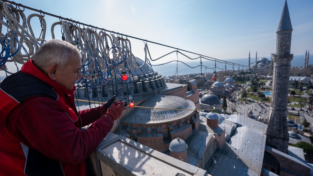 Bu kapsamda Ayasofya-i Kebir Cami-i Şerifi'nin minarelerinin arasına asılan "La ilahe illallah" yazılı mahyanın bakımını gerçekleştiren Vakıflar Genel Müdürlüğü ekipleri, yanmayan ampulleri yeniledi.