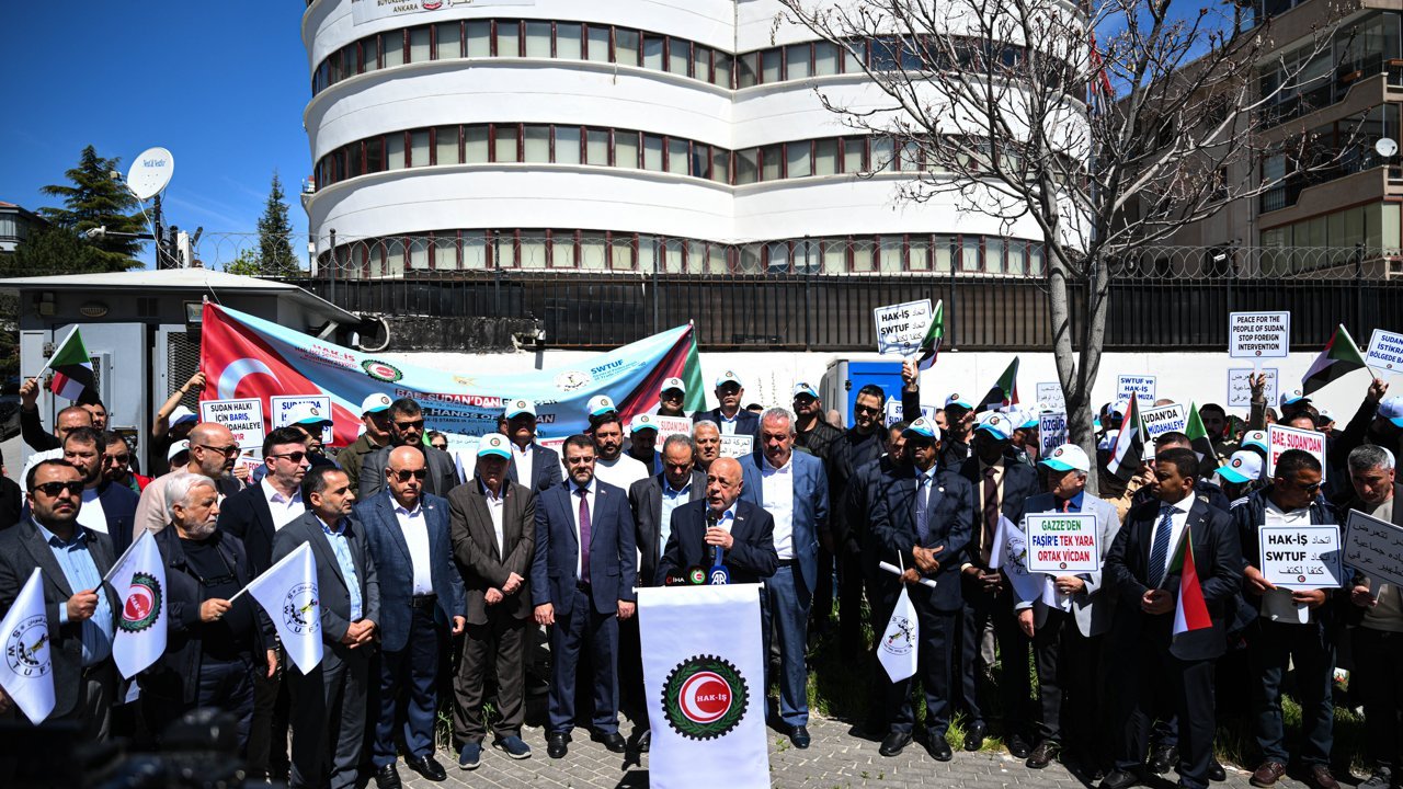 HAK-İŞ Genel Başkanı Mahmut Arslan, burada yaptığı basın açıklamasında, BAE'nin, siyonist devlet İsrail ile işbirliği yaparak nasıl ki Gazze'deki katliamlara destek vermişse, nasıl ki Arap Birliği'ne, Filistin halkına ihanet etmişse, şimdi de Sudan halkına ihanet ettiğini söyledi.