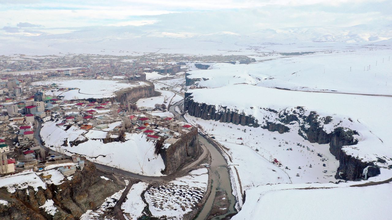 AĞRI (AA) - Ağrı'nın Diyadin ilçesinde bahar mevsiminde de beyaz örtüyle kaplanan doğa harikası Murat Kanyonu, gece ve gündüz dronla görüntülendi.