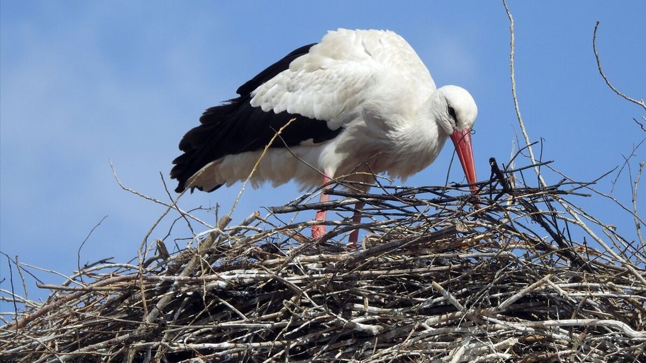 Kısmen karla kaplı ilçeye gelmeye başlayan baharın müjdecisi leylekler, elektrik direklerine ve çatılara yuvalarını yaptı.