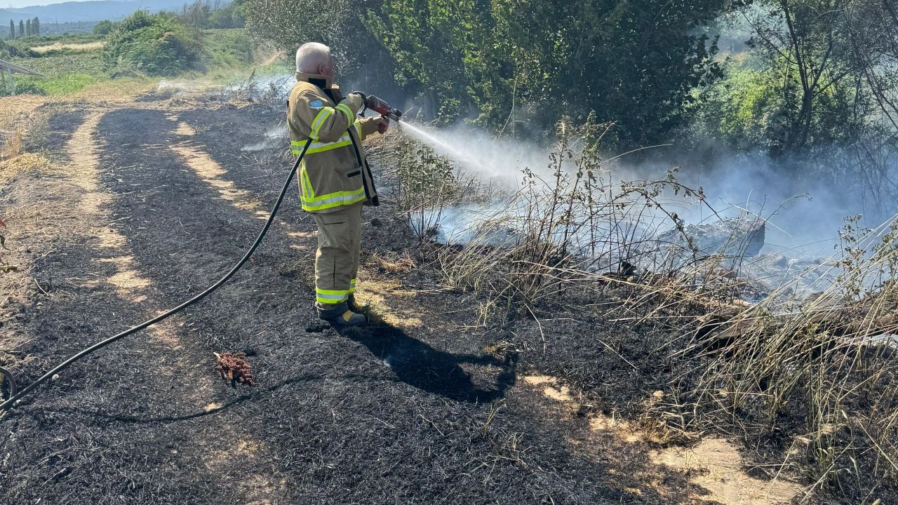 Yeşilhisar Mahallesi Yağcıllı Deresi mevkisinde sulama hattındaki çalışma sırasında metal boru kesilirken çıkan kıvılcımlar otları tutuşturdu.