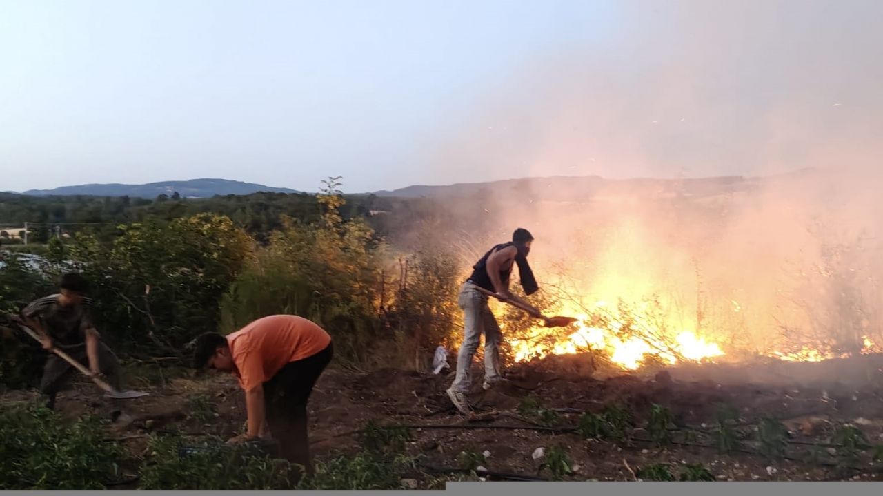 Bu arada vatandaşlar da küreklerle alevlerin üzerine toprak atarak söndürme çalışmalarına destek veriyor.