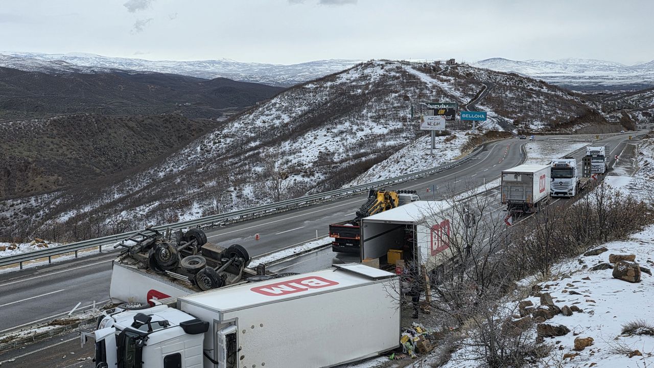 Sürücüsünün ismi henüz öğrenilemeyen 34 BBK 330 plakalı tır, Bingöl-Elazığ kara yolu Topalan köyü mevkisinde devrildi.