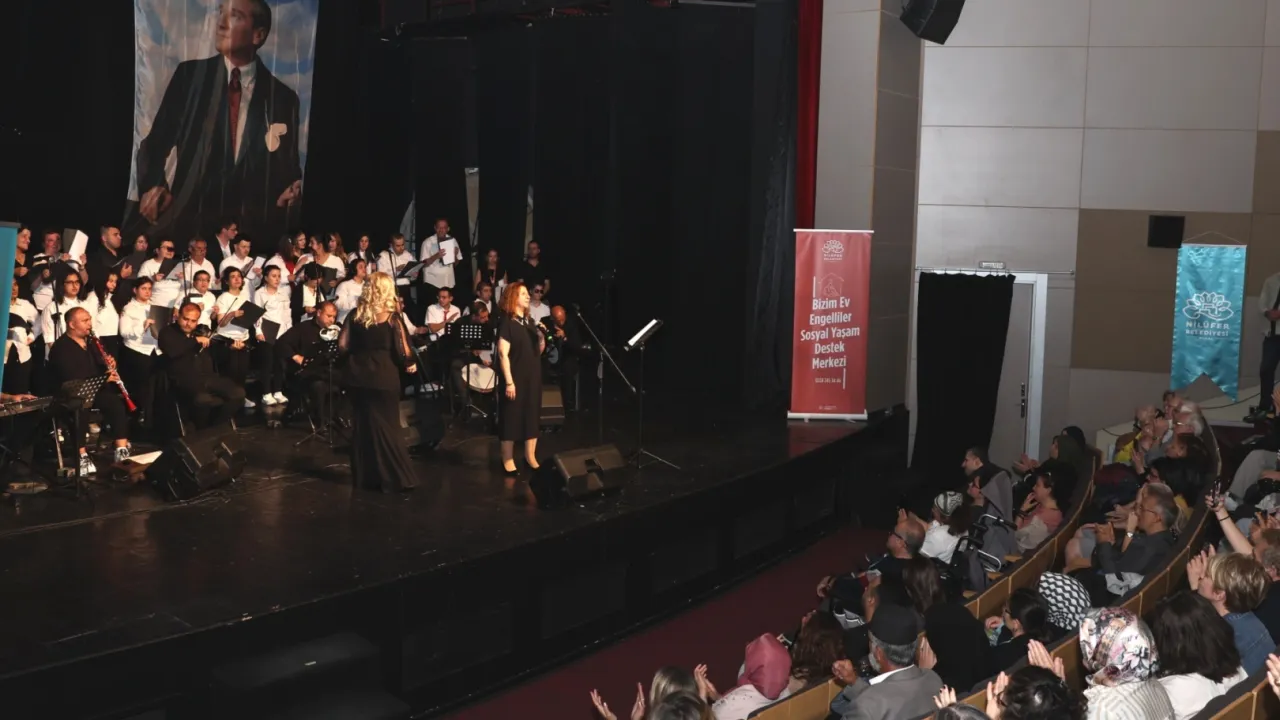 Bursa'da Nilüfer Belediyesi Bizim Ev Engelliler Sosyal Yaşam Destek Merkezi’nde bir yıl boyunca çeşitli alanlarda eğitim alan engelli bireyler, yıl sonu konserinde sahneye çıktı. Yeşilçam şarkıları söyleyen koro, konser sonunda büyük alkış aldı.BURSA (İGFA) - Nilüfer Belediyesi’nin çeşitli atölye ve etkinliklerle, engelli vatandaşlara sosyal yaşama katılma imkanı sunan Bizim Ev Engelliler Sosyal Yaşam Destek Merkezi katılımcıları, yıl sonu gösterisinde sahne aldı.