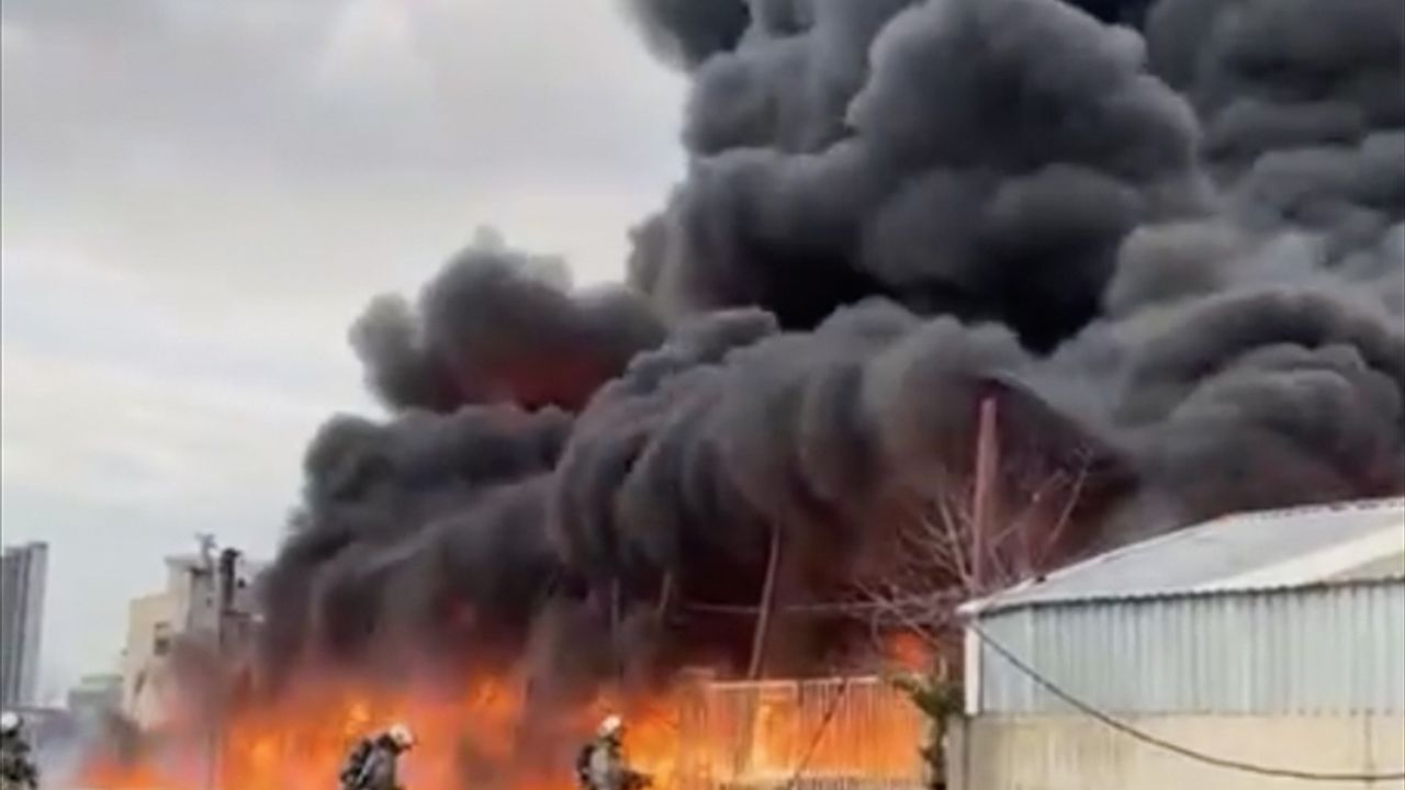 İSTANBUL (AA) - Büyükçekmece'de, bir fabrikanın açık alanında bulunan palet ve plastik kasalarda çıkan yangına itfaiye ekipleri müdahale ediyor.