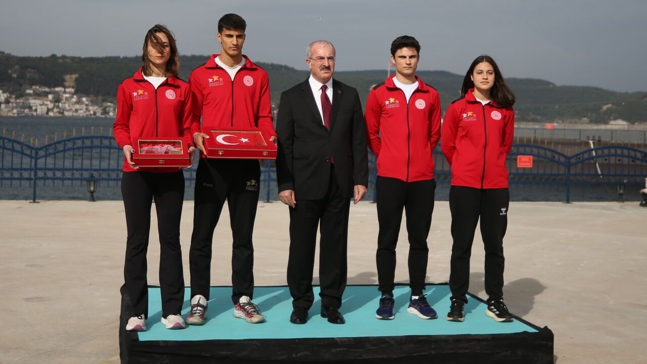 Daha sonra Çanakkale Valisi Ömer Toraman, Gelibolu Yarımadası'ndan alınan toprak, su ve Türk bayrağını öperek atlet öğrenciler Nilhan Akaman ve Mehmet Serbes'e teslim etti.