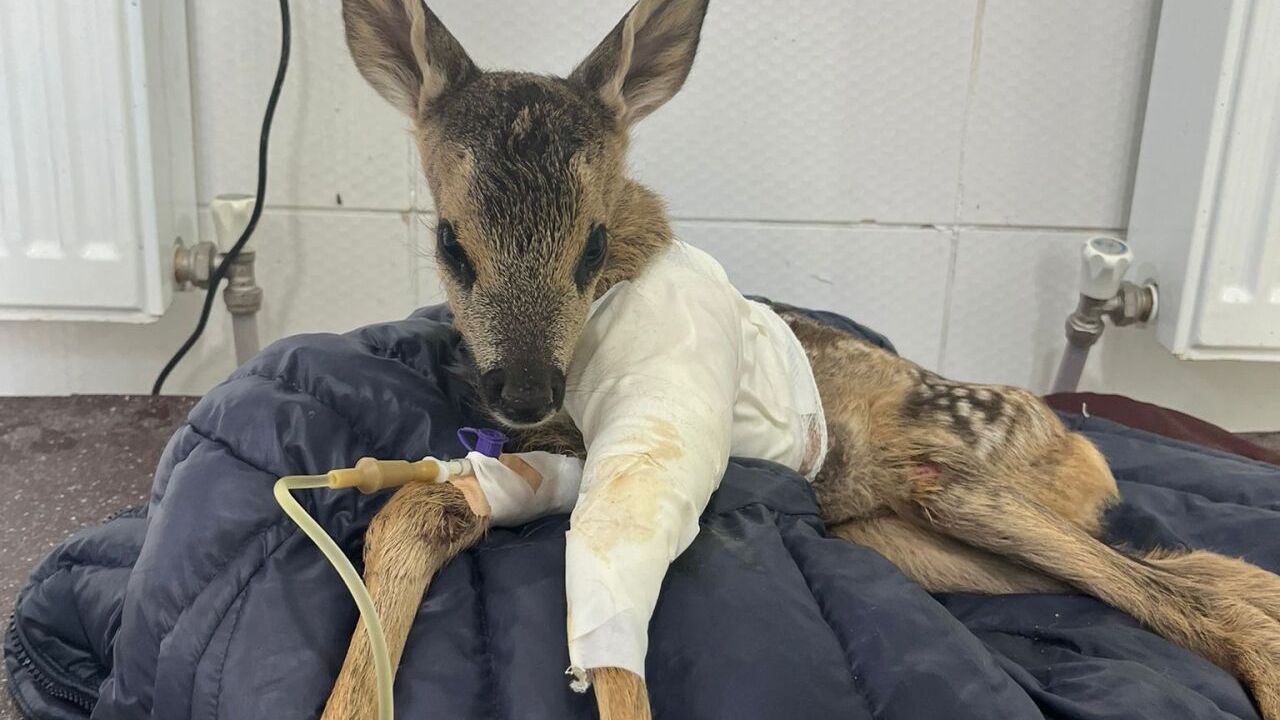 Veteriner hekim tarafından yapılan muayenede, karacanın ön bacağında kırık ve vücudunda çarpmaya bağlı çeşitli yaralanmalar tespit edildi.