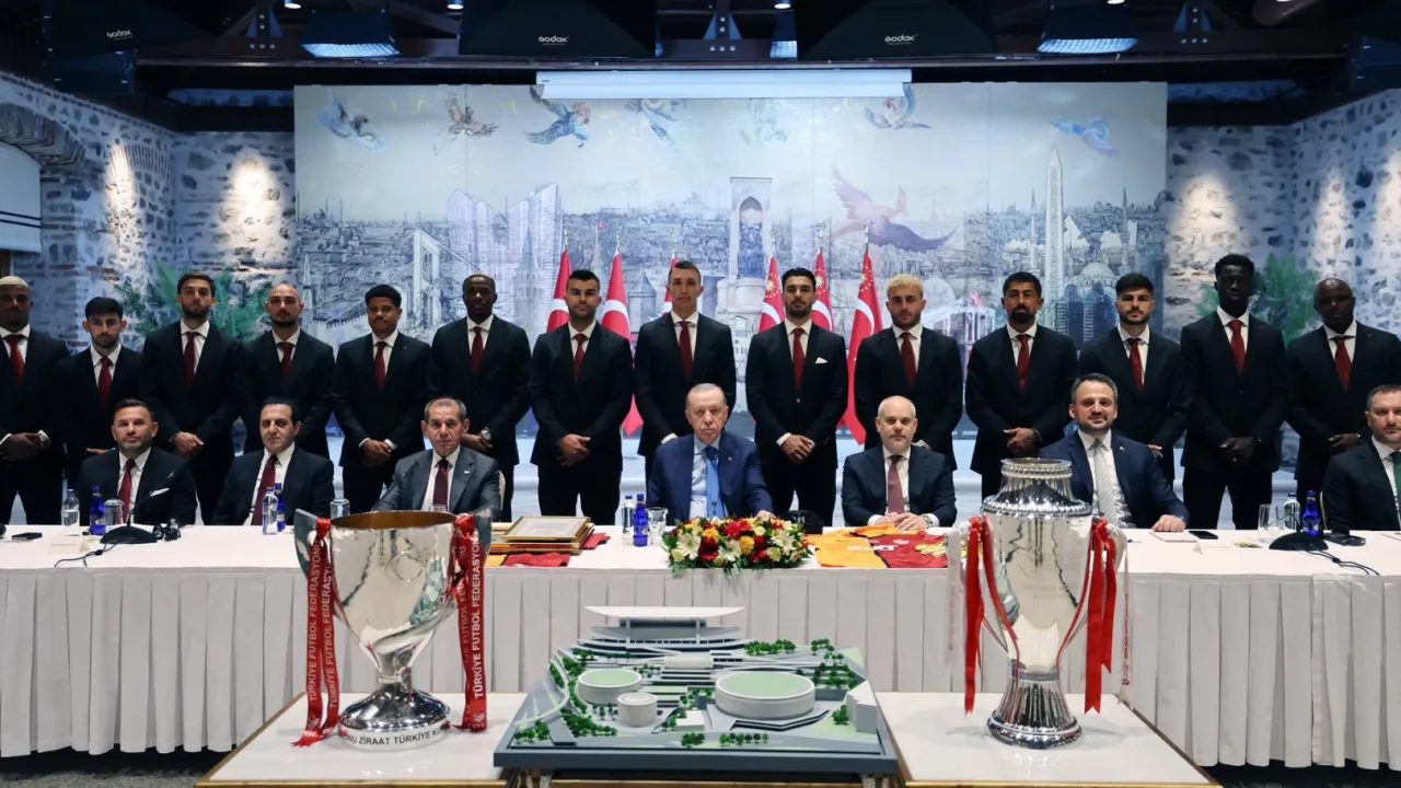 Cumhurbaşkanı Erdoğan, Süper Lig 2024-2025 şampiyonu Galatasaray yönetici, teknik ekip ve sporcularını Dolmabahçe Çalışma Ofisi'nde kabul etti.ANKARA (İGFA) - Ziyarette, Galatasaray Kulübü Başkanı Dursun Özbek, Teknik Direktör Okan Buruk ve futbolcular yer aldı.