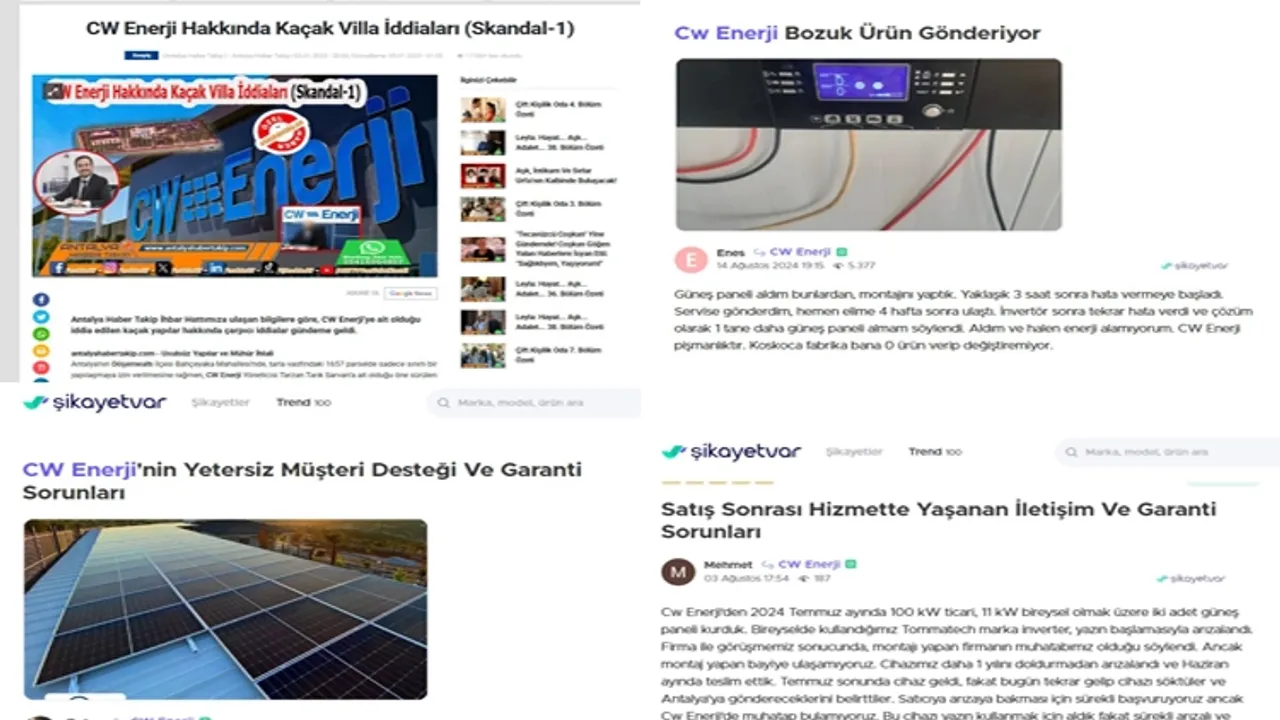 Bir vatandaş da, aldığı ürünün kısa sürede bozulduğuna dikkat çekerek, “CW Enerji ürünlerinin arkasında durmuyor. Didim'deki yazlığıma kurduğumuz 80 adet güneş panelli sistemde inverterler bozuldu diye aldılar, geri yolladılar. Rapor dahi yollamadılar. Cihaz yeniden bozuldu, kimse gelip destek olmuyor. Milyonluk yatırım çöp oldu. Ürünlerin garantisi olduğu halde hiçbir şekilde sorun çözmüyorlar. Şikayetçiyim, dava açacağım.” ifadelerini kullandı.