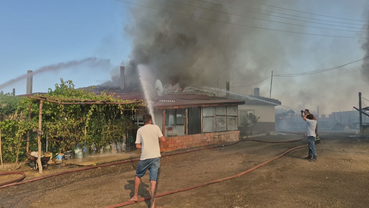 Rüzgarın etkisiyle alevler bahçedeki 2 ev ile yaklaşık 20 bin samanın bulunduğu depoya sıçradı.