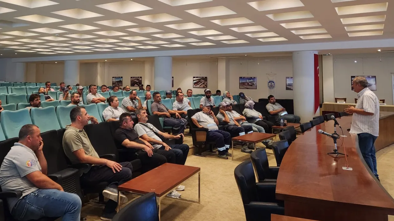 Efes Selçuk Belediyesi İklim Değişikliği ve Sıfır Atık Müdürlüğü’ne bağlı İş Sağlığı ve Güvenliği birimi Efes Selçuk Belediyesi Temizlik İşleri Müdürlüğü’nden gelen taleple İş Sağlığı ve Güvenliği Eğitimi düzenledi.İZMİR (İGFA) - İzmir'de belediye emekçilerinin iş sağlığı ve güvenliği konusunda bilinçlendirilmesi ve daha güvenli bir iş ortamı oluşturulması için düzenlenen eğitime, Efes Selçuk Belediyesi Temizlik İşleri Müdürlüğü’nde görevli 55 personel katıldı.