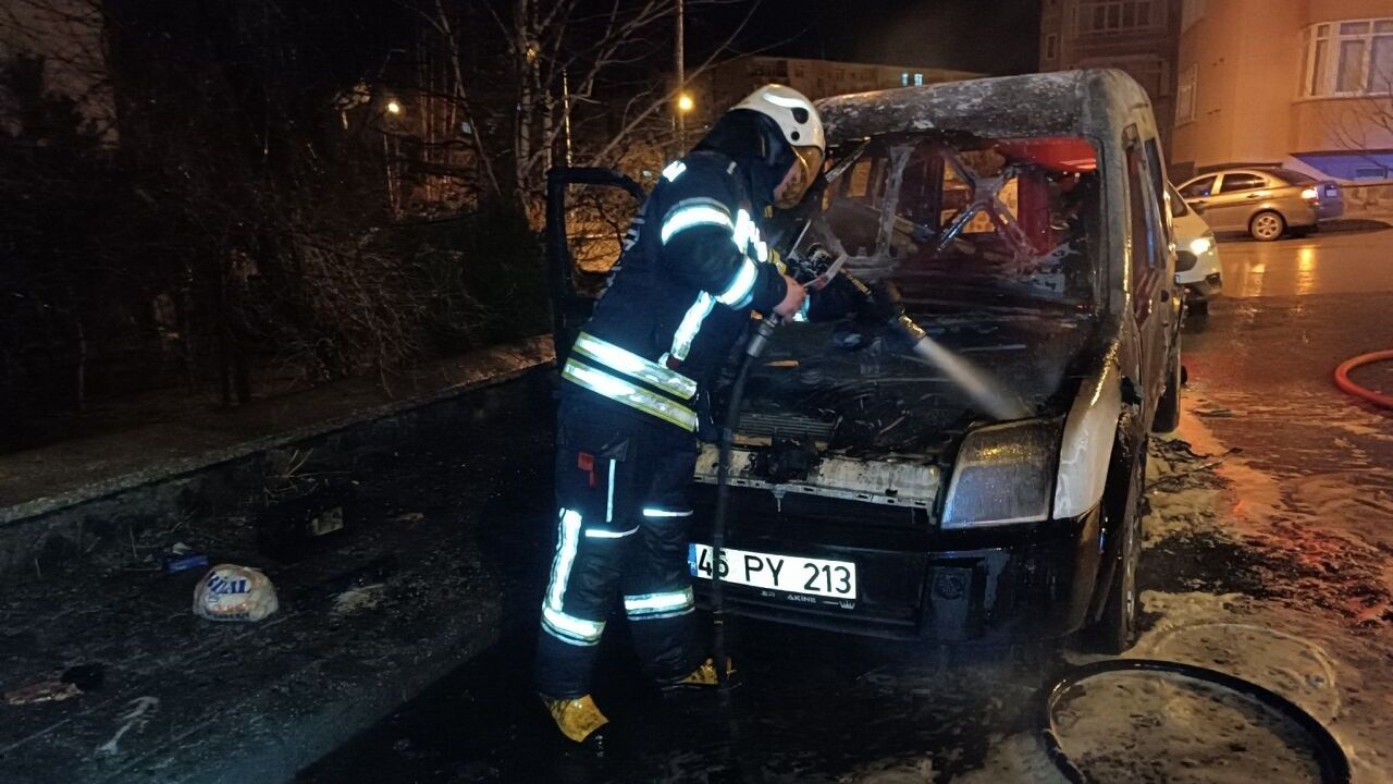 Merkez Palandöken ilçesi Yunus Emre Mahallesi'nde, gece park halindeki 45 PY 213 plakalı hafif ticari araçta yangın çıktı.