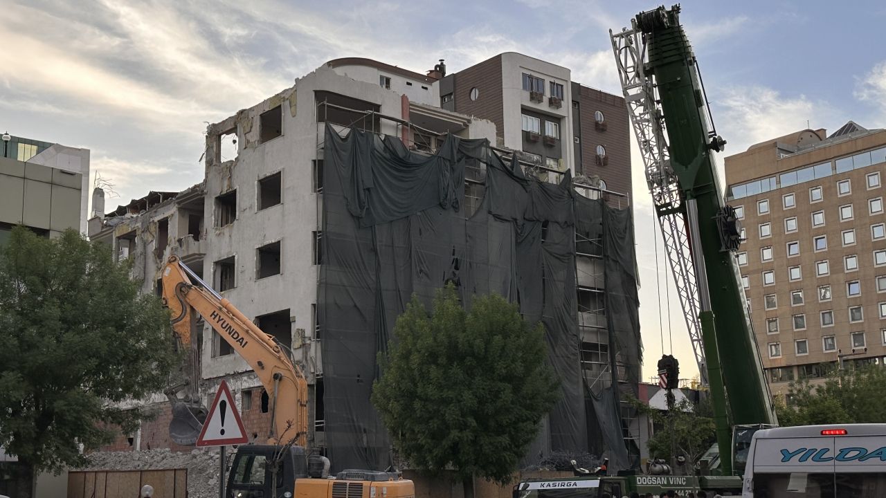 Değirmiçem Mahallesi'nde, Kahramanmaraş merkezli 6 Şubat depremlerinde ağır hasar gören apartmanın yıkımı için bir süre önce çalışma başlatıldı.