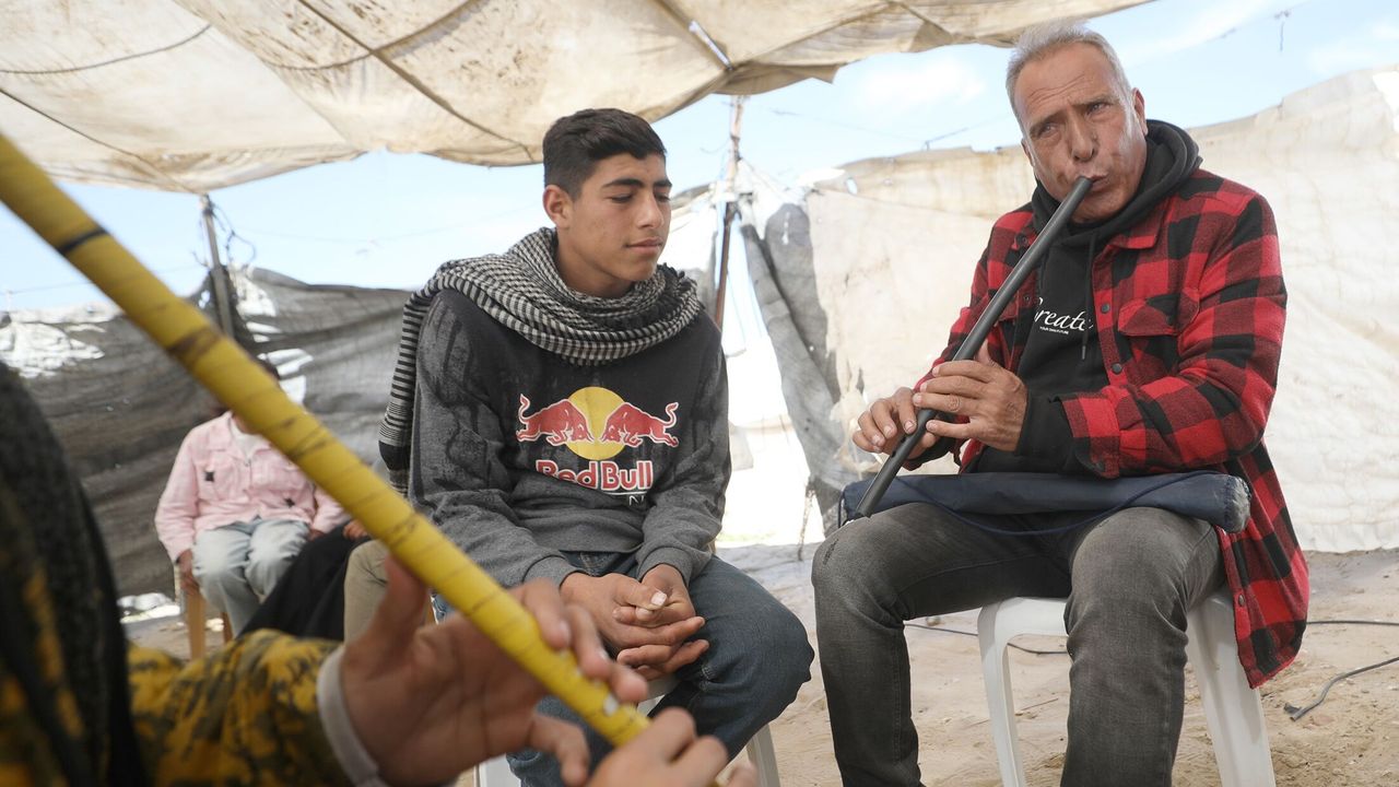Filistinli müzik öğretmeni Ahmed Ebu Emşa (45) da iptidai şartlara rağmen bölgedeki gençler ile çocukları müzikle tanıştırıyor. Ebu Emşa, çadırdan oluşan derslikte nota ve ses eğitiminin yanı sıra gitar, keman, ney ve darbuka dersleri veriyor.