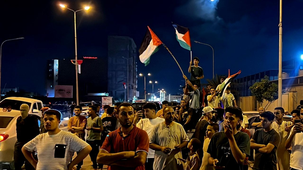 Libya ve Filistin bayraklarıyla sokaklara dökülen yüzlerce Zliten sakini, Gazze ablukasının kırılmasını talep eden sloganlarla konvoyu karşıladı.