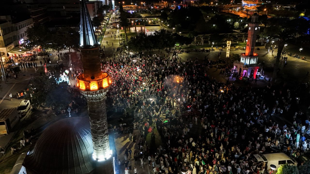 Türk ve Filistin bayrakları taşıyan grubun yürüyüşü, Konak Atatürk Meydanı'nda sona erdi.