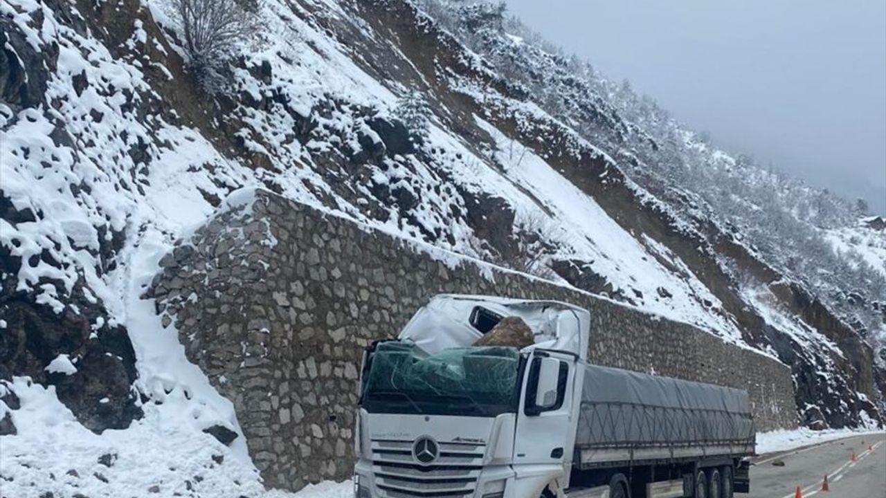 GÜMÜŞHANE (AA) - Gümüşhane'nin Torul ilçesinde üzerine kaya parçası düşen seyir halindeki tırın sürücüsü yaralandı.