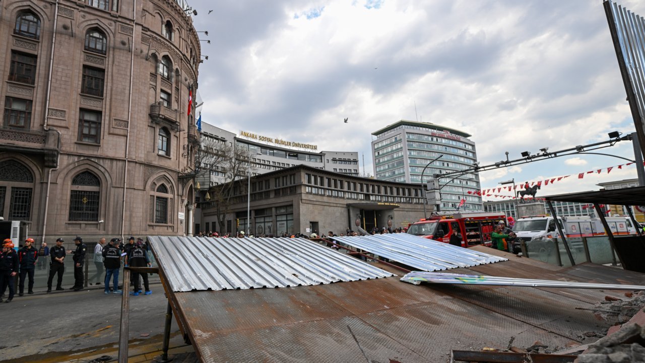 Ulus'ta yıkım çalışmaları yürütüldüğü için etrafı demir koruyucu platformla çevrilen 4 katlı binanın platformu yola doğru çöktü.