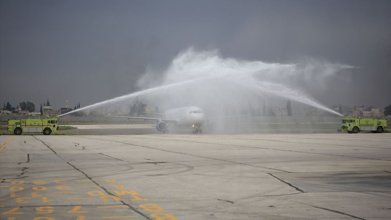 Şam Uluslararası Havalimanı'ndan gelen uçak, havalimanında törenle karşılandı ve Halep'ten Şam'a uçuş gerçekleştirildi.