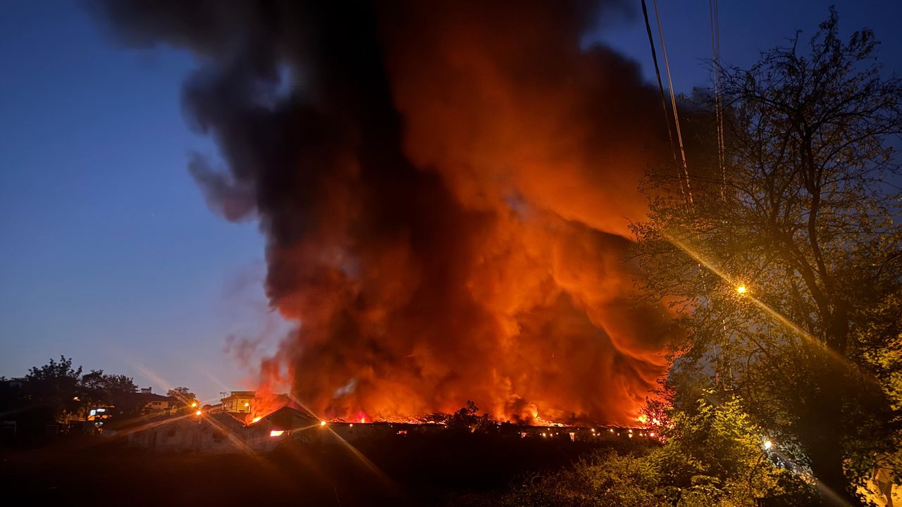 Yangın nedeniyle bölgede yoğun duman oluşurken, ara ara patlama sesleri duyuldu.