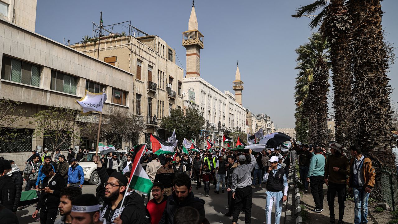 Suriye'nin tarihi öneme sahip Emevi Camisi'nde kılınan cuma namazının ardından başlayan gösteride, katılımcılar İsrail ve İsrail Başbakanı Binyamin Netanyahu karşıtı sloganlar attı.