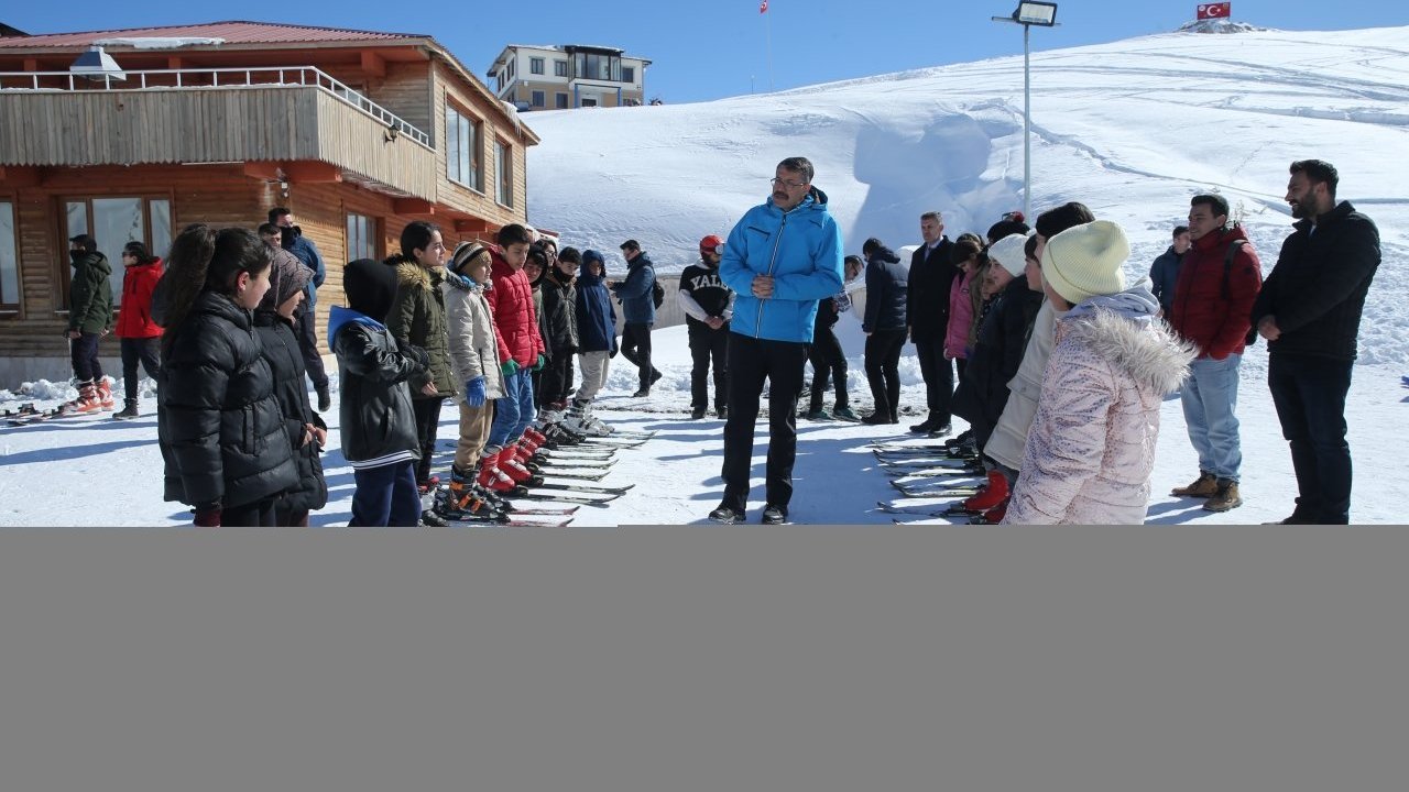 Valiliğin tahsis ettiği araçlarla 2 bin 800 rakımlı Mergabütan Kayak Merkezi'ne götürülen öğrecilere, antrenörler tarafından kayak eğitimi veriliyor.