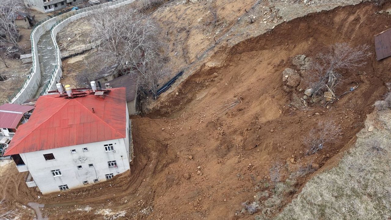 HAKKARİ (AA) - Hakkari'nin Şemdinli ilçesinde sağanağın ardından meydana gelen heyelanda 3 katlı bir evin birinci katı zarar gördü.
