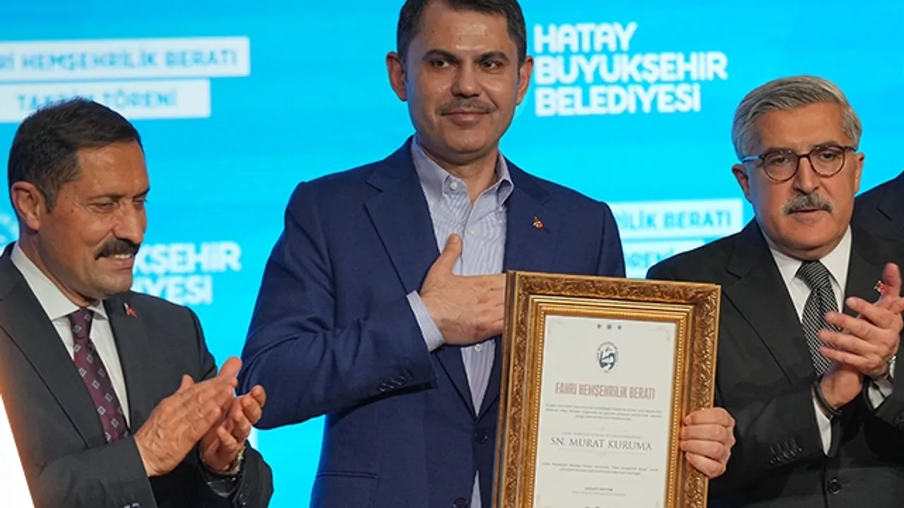 Çevre, Şehircilik ve İklim Değişikliği Bakanı Murat Kurum’a Hatay’daki gayretli çalışmaları nedeniyle hemşehrilik beratı verildi. Bakan Kurum “Hatay sevdamız hemşehrilik beratıyla taçlanıyor. Bölgenin parlayan yıldızı haline getirecek adımları atacak ve inşallah Hatay'ımızı şaha kaldıracağız" dedi.HATAY (İGFA) - Hatay Büyükşehir Belediye Meclisi, asrın felaketinin ardından gösterdiği öz verili çalışmaları nedeniyle Çevre, Şehircilik ve İklim Değişikliği Bakanı Murat Kurum’a fahri hemşehrilik beratı verilmesini kararlaştırdı.