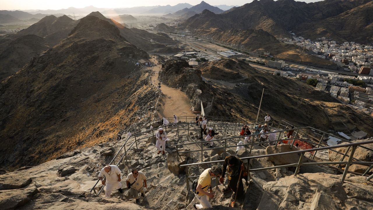 Yaklaşık bir saat süren oldukça dik ve zorlu yürüyüşün ardından 550 metre yüksekliğindeki zirveye ulaşan hacı adayları, Nur Dağı'nın zirvesinden 20 metre aşağıda bulunan Hira Mağarası'na iniyor.