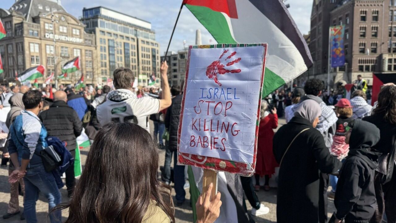 Amsterdam Dam Meydanı'nda toplanan göstericiler, Filistin bayraklarının yanı sıra "Çocukların öldürülmesine hayır", "Şimdi Ateşkes", "Boykot İsrail" yazılı pankartlar taşıdı.