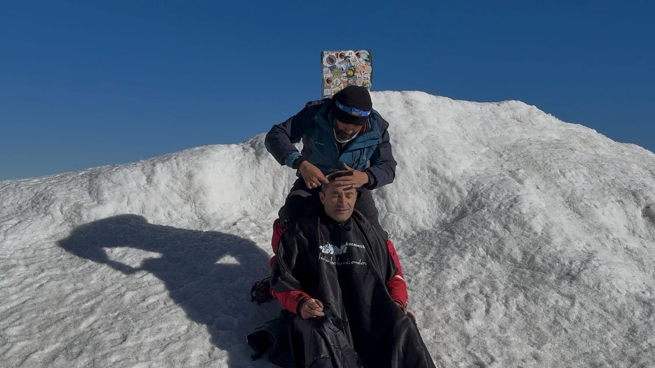 5 kişilik grupla yaklaşık 3 günde zirveye çıkan Akay, burada beraberinde getirdiği tıraş ekipmanlarıyla, sürekli müşterisi olan Serkan Üç'ü tıraş etti.