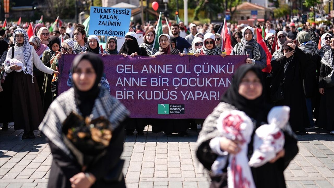 Ellerinde Türk ve Filistin bayrakları taşıyan katılımcılar, "Anneler evlat doğuruyor, İsrail toprağa gömüyor", "Zulme sessiz kalan zalime ortak olur", "İsrail Avrupa kıyılarında vicdanı vurdu", "Anne olmak bir insan hakkıdır. Peki Filistinli annelerin hakkı nerede?" yazılı pankart ve dövizler taşıdı.