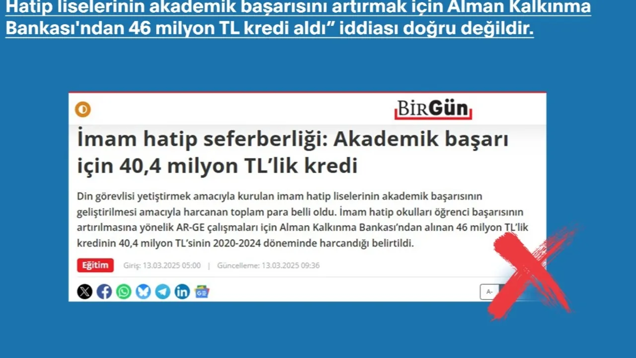 Dezenformasyonla Mücadele Merkezi tarafından yapılan açıklamada, bahse konu haber içeriğinin, Cumhurbaşkanlığı Strateji ve Bütçe Başkanlığı 2025 Yılı Yatırım Programında yer alan bilgilerin çarpıtılmasıyla hazırlandığı tespit edildiği belirtilerek ,"İlgili haberde bahsi geçen Alman Kalkınma Bankası ile Millî Eğitim Bakanlığı Din Öğretimi Genel Müdürlüğü arasında imam hatip liselerinde akademik başarıyı artırmaya yönelik bir proje finansman anlaşması yoktur. 2025 Yılı Yatırım Programı'ndaki proje numaraları incelendiğinde, bahse konu kalemin İnşaat Emlak Genel Müdürlüğünün fonu olduğu açıkça görülmektedir. Asılsız iddialara itibar etmeyiniz" ifadeleri yer aldı.