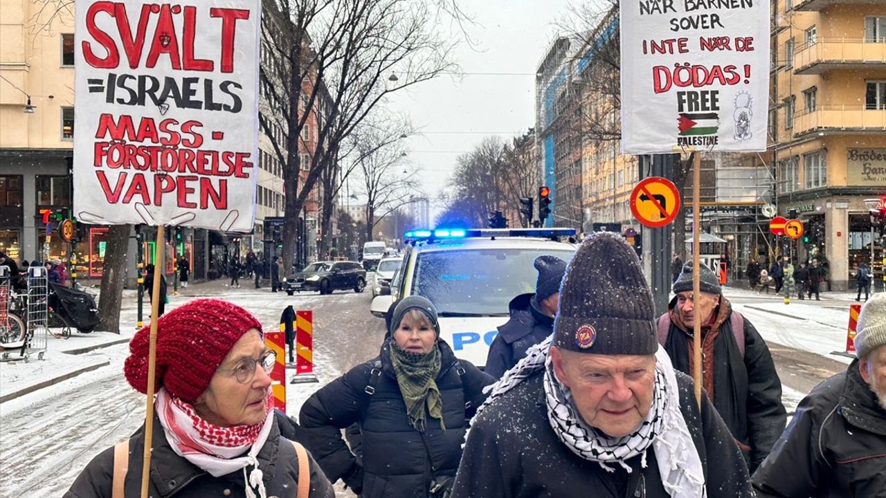 'Gazze'de çocuklar öldürülüyor', 'Okullar ve hastaneler bombalanıyor', 'Gazze'de saldırı durdurulsun' ve 'Gıda kısıtlamasına son verilsin', 'İsrail barış anlaşmasına uysun' yazılı pankartlar taşıyan göstericiler, İsrail'in Gazze'ye yönelik soykırımı ve hava saldırısını durdurmasını ve İsveç'in İsrail'e silah satışına son vermesini talep etti.