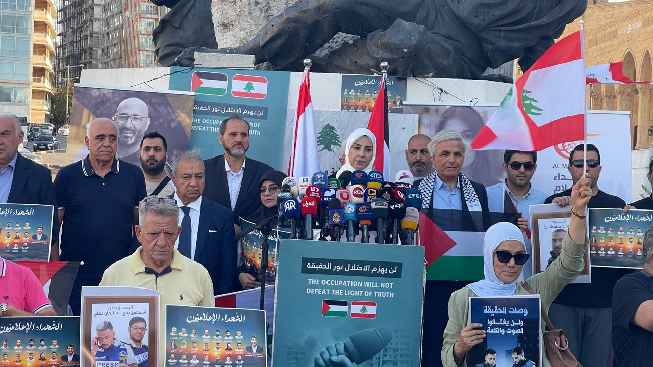 Göstericiler, Filistin ve Lübnan bayraklarının yanı sıra İsrail saldırılarında hayatını kaybeden gazetecilerin fotoğrafları ve üzerinde 'İsrail gazetecileri öldürüyor', 'Hakikat, gazetecilerin kanı ve özgürlüğün mürekkebiyle yazılır' yazılı dövizler taşıdı.