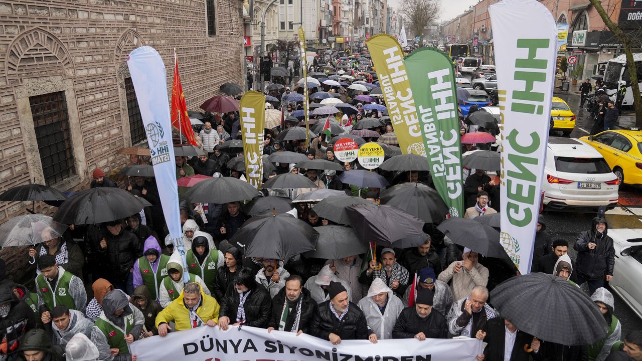 İSTANBUL (AA) - İnsan Hak ve Hürriyetleri (İHH) İnsani Yardım Vakfı, Filistin'e Destek Platformu ve İslami Dayanışma Platformu öncülüğünde, 'Coğrafyamızda işgalci İsrail ve Amerikan askeri istemiyoruz' sloganıyla Fatih Camisi'nden Beyazıt Meydanı'na yürüyüş düzenlendi.